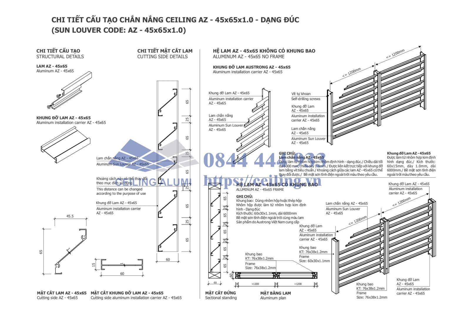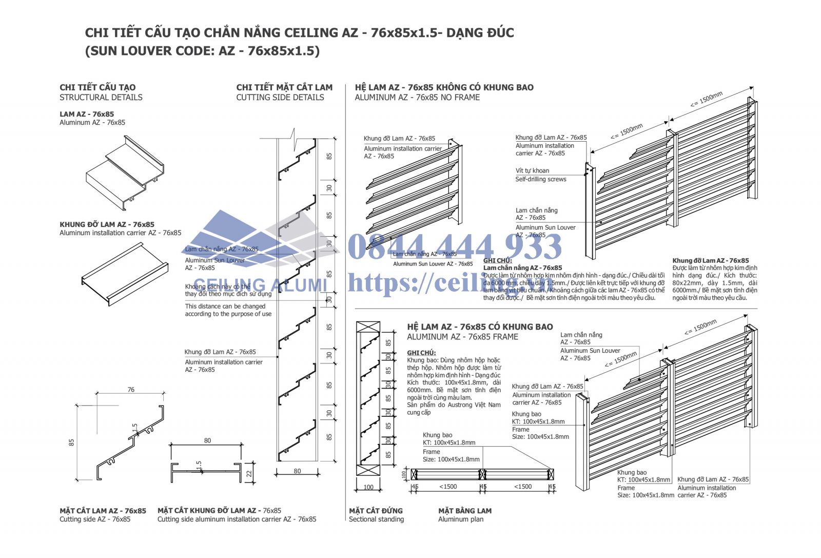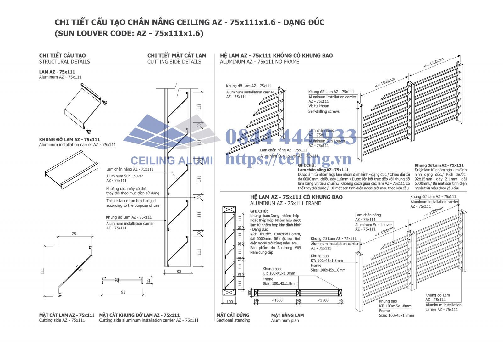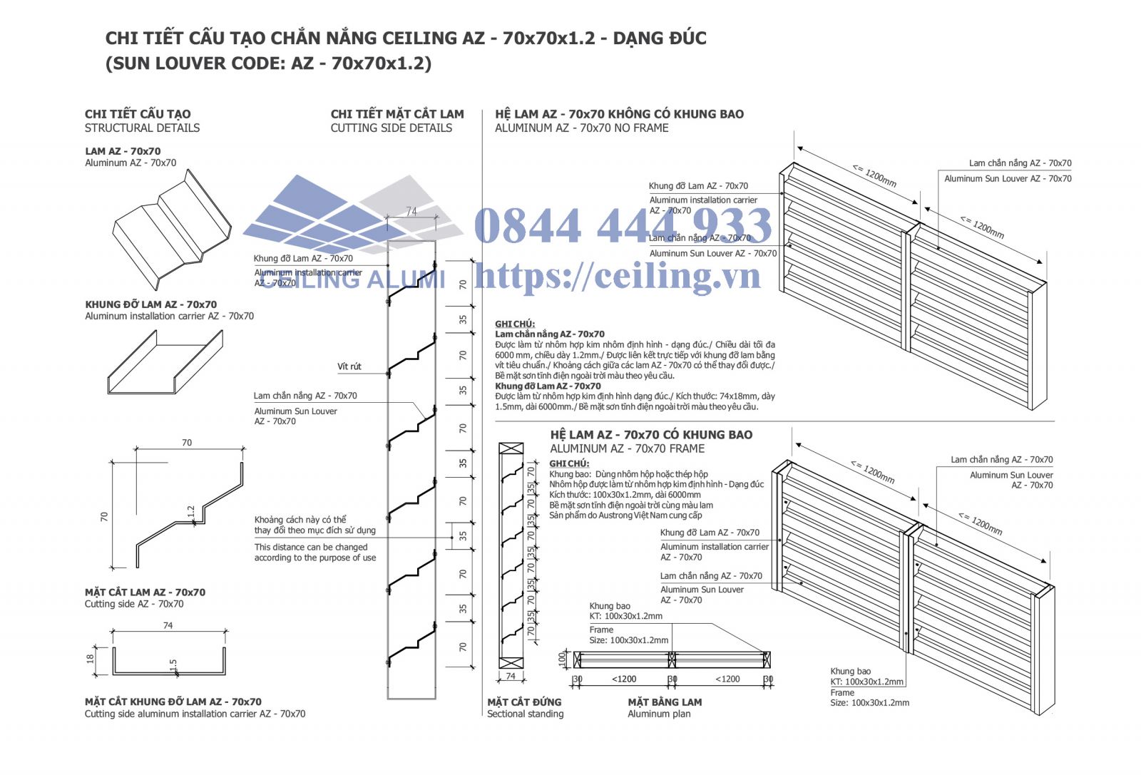 Hệ chắn nắng Ceiling AZ - Sun Louver là hệ chắn nắng mặt đứng cố định lắp ngang, sản phẩm được liên kết với hệ khung bao và phụ kiện đồng bộ, bề mặt được phủ Sơn tĩnh điện, Sơn PVDF với nhiều mầu sắc đa dạng, độ dài lam được sản xuất theo yêu cầu tùy theo thiết kế của dự án, sản phẩm mang tính hiện đại và tính thẩm mỹ rất cao. Sản phẩm có độ ổn định cao, hoàn toàn chống cháy và chống nước, không bị oxy hóa, hoàn toàn loại bỏ yếu tố xâm thực của môi trường. Ceiling Group luôn nghiên cứu và phát triển để tạo ra các sản phẩm thân thiện với môi trường, bảo tồn năng lượng, hiệu quả và bền vững. Tất cả các sản phẩm của Ceiling Group đều có thể tái chế 100%