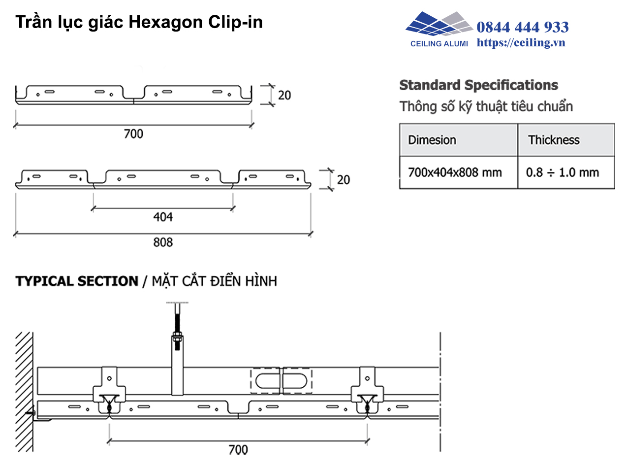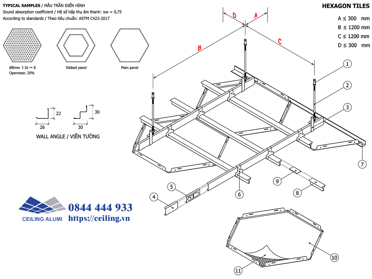 Trần lục giác Hexagon Clip-in được làm từ nhôm hợp kim 100% (thường là Aluminum 1001-3003 hoặc thép hợp kim H24), phủ lớp sơn tĩnh điện hoặc gia nhiệt tiêu chuẩn. Điều này giúp sản phẩm chống ăn mòn, không cong vênh và giữ màu sắc bền đẹp theo thời gian.